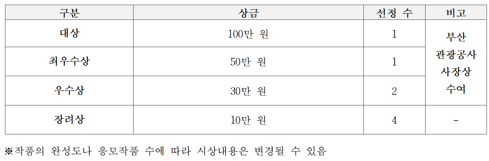 · 시상내용: 부산관광공사장 수상 및 총 상금 2,500,000원, 12명(또는 팀) 선정