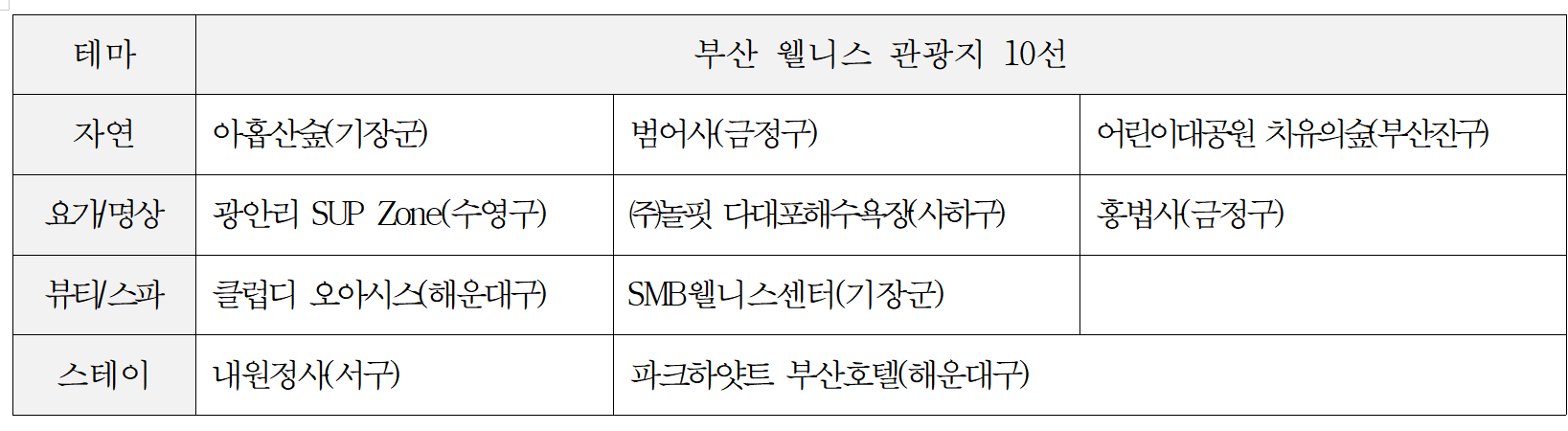 - 부산 웰니스 관광지 10선을 활용한 체류형·체험형 관광 상품 기획