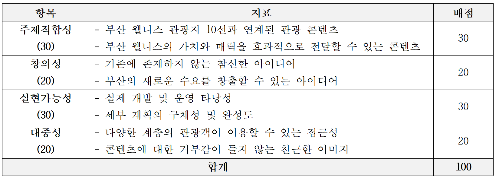 - 부산의 역사, 문화, 자연, 체험 등 다양한 매력을 담아 참신하고 실현 가능한 관광  콘텐츠 제안